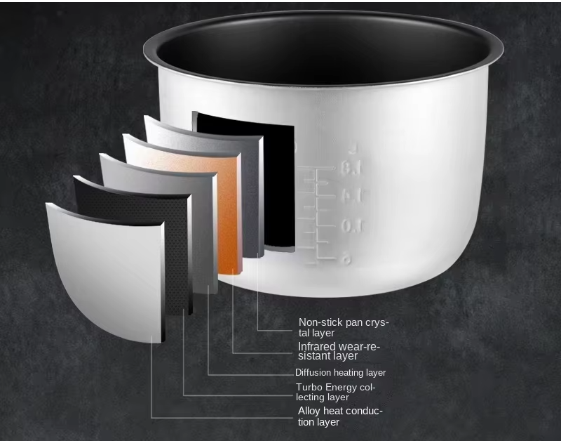 Construida con material ABS de primera calidad y 5 capas de fundición a presión, esta olla arrocera garantiza una transferencia de calor rápida y uniforme para una cocción eficiente. El interior está recubierto con un revestimiento antiadherente, lo que garantiza una fácil limpieza y mantenimiento.